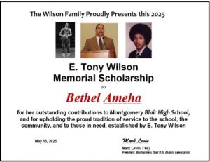 “Dear Family of Dr. Leonard Levin and the Montgomery Blair Alumni Association, I am deeply thankful for Dr. Levin and his family’s generous support, which has made furthering my education possible. I am passionate about increasing diversity in STEM, providing representation for underrepresented and low-income students, and contributing to the causes of inclusivity and equality step by step. Like Dr. Levin, I aspire to continue my education beyond my undergraduate studies. My journey “to expand knowledge,” or Crescens Scientia, has just begun. High school is just the starting line, and this scholarship will significantly support me on this path. Thank you once again for this incredible opportunity.” – Linda Huang